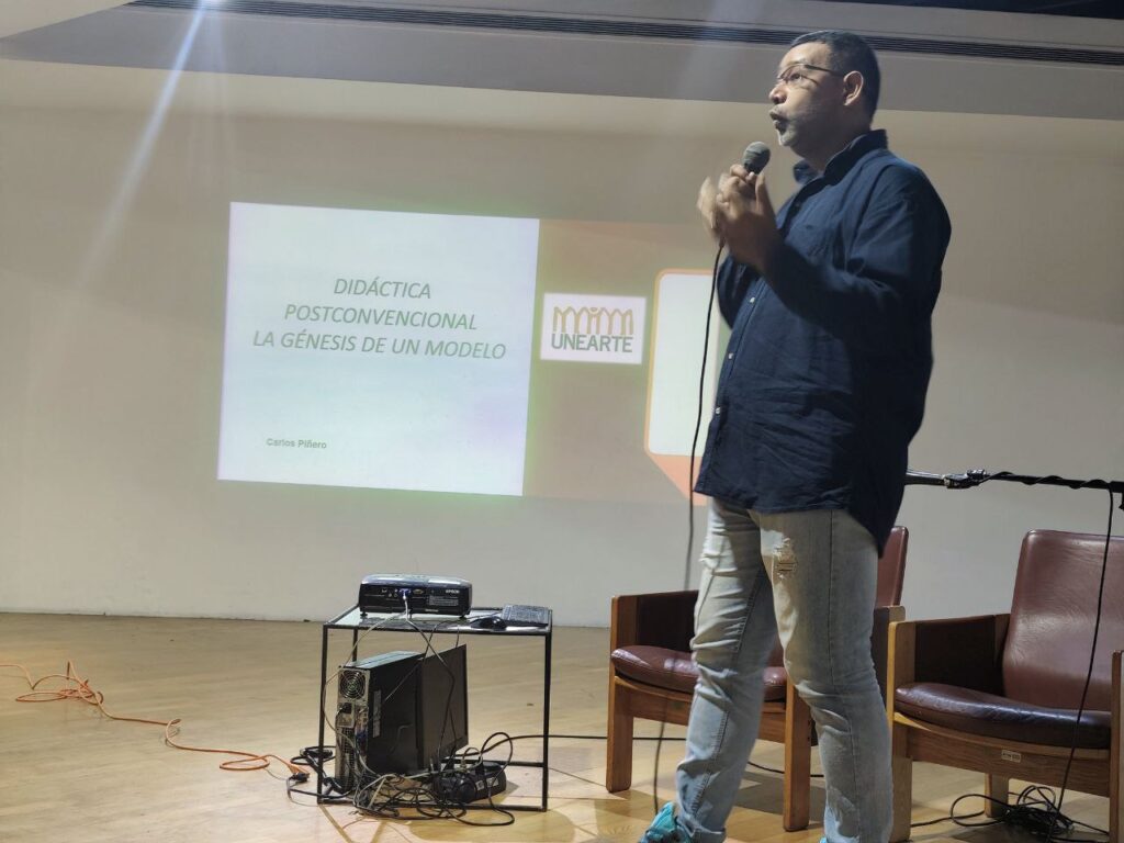 El Dr. Piñero comenzó su intervención definiendo la didáctica como «la forma en que damos clase» y abogó por una didáctica posconvencional que «es ir más allá de todo lo que existe» y «romper con lo que existe.» Esto dentro de lo que fue su ponencia inspiradora titulada «Didáctica Postconvencional: La Génesis de un Modelo» durante las Jornadas Regionales de Investigación 2025 del Centro de Educación Artística Integral (CECA) Modesta Bor, desde el @museodeartecontemporaneo_ve